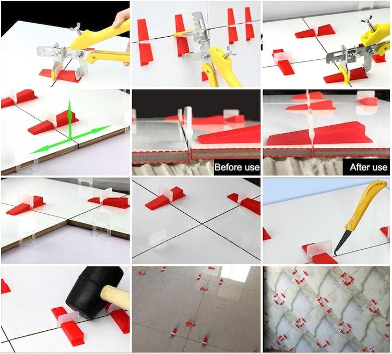 Sistemul de nivelare a placilor este usor de utilizat. Pur si simplu asezati distantierele sub tigla, plasati ciment si o alta tigla, apasati pene de plastic in distantierele de tigla si apoi folositi clesti pentru a le impinge in jos.