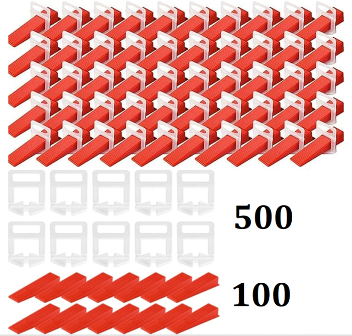 Sistemul de nivelare a placilor contine 500 de distantiere de placi, 100 de pene de placi, in total 600 de bucati.